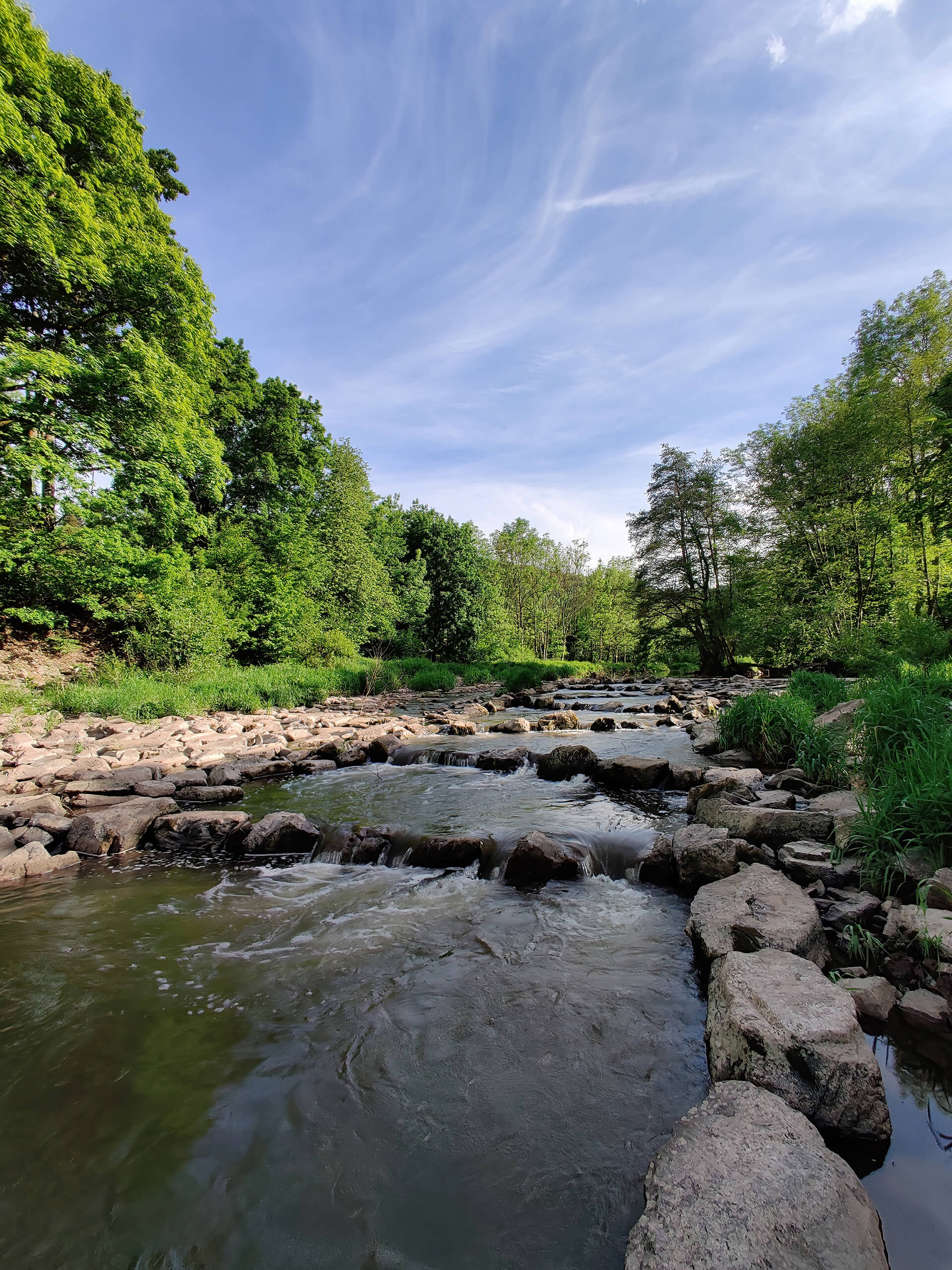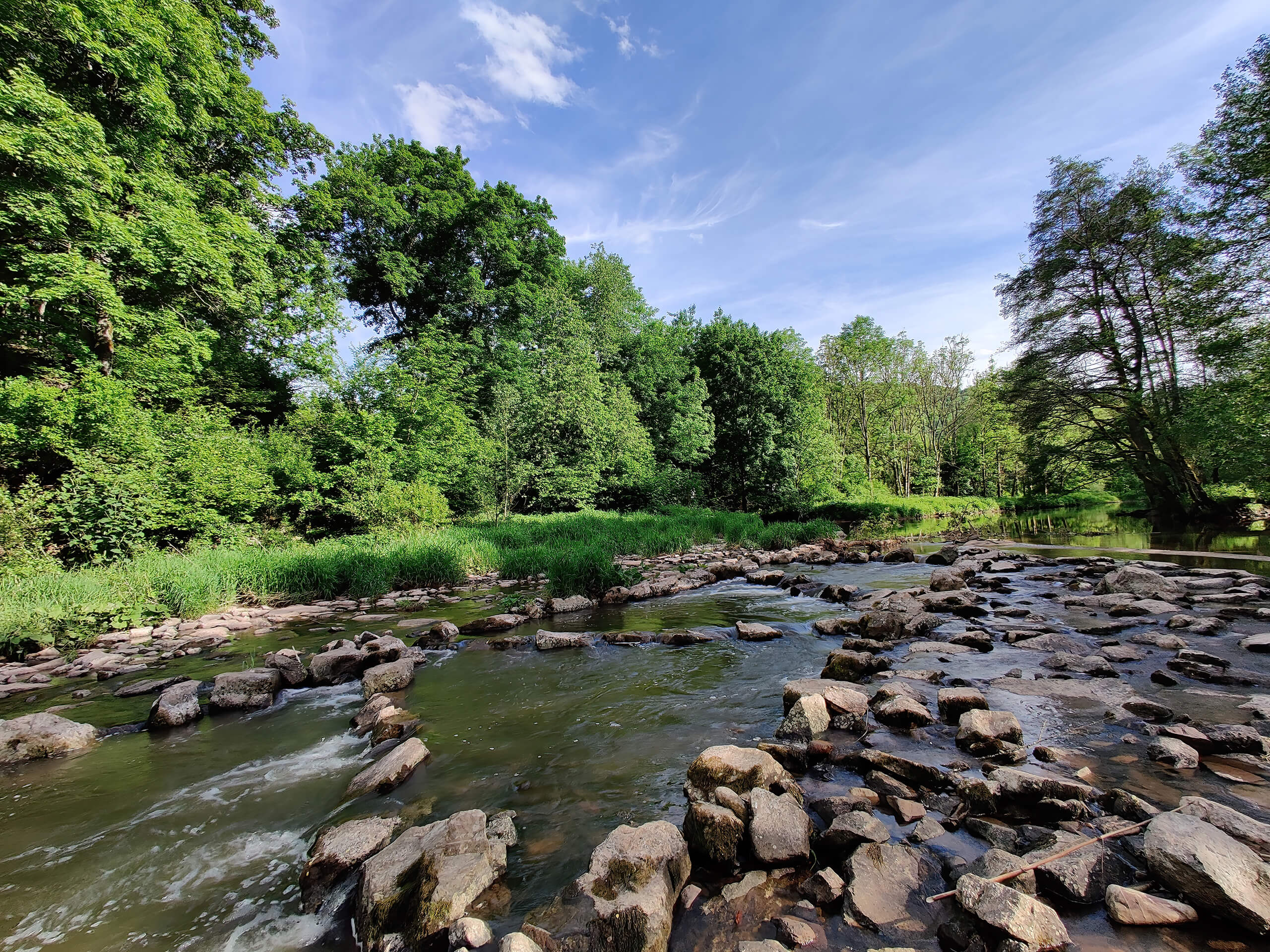 Der Fluss fließt über eine Strecke von ca. 1,2 km entlang des Grundstücks. Das Gefälle ist unterschiedlich, sodass sich abwechselnd schnell fließende, flache Bereiche sowie ruhigere, tiefere Abschnitte ausbilden. Das Fischereirecht erstreckt sich ununterbrochen über die gesamte Strecke, jedoch beidseitig nur auf etwa 20 % der Uferlänge.
