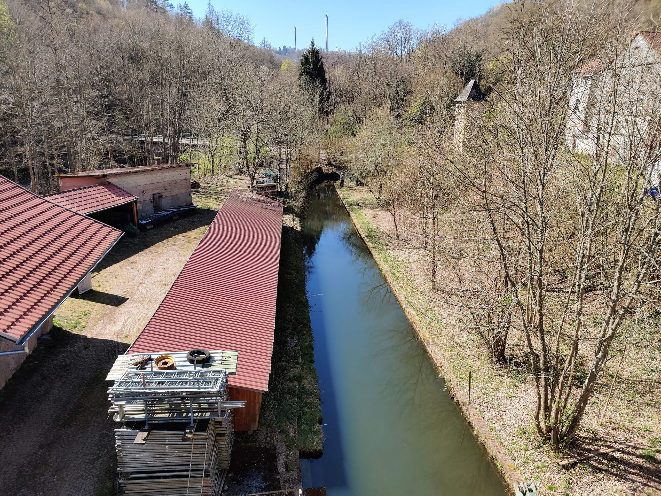 Der Untergraben (Auslauf) der Turbinen befindet sich am hinteren, dem Fluss zugewandten Seite des Mühlenwohnhauses, direkt neben dem großen Werkstattgebäude.