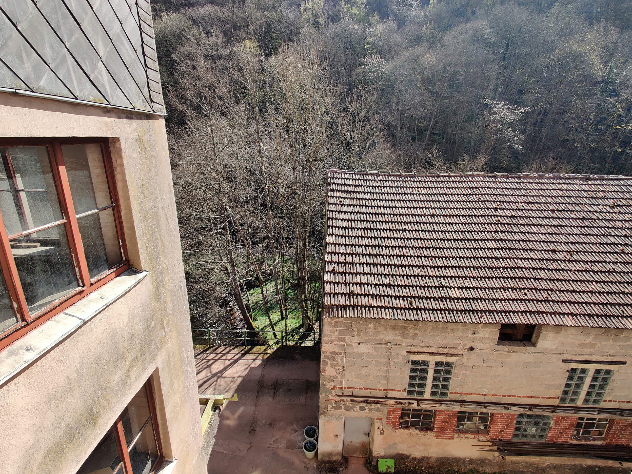 - Ehemalige Mühle mit Werkstattbereichen und Lagerflächen, Kellerwerkstatt mit LKW Stellplatz und Zugang zu Heizraum und Turbinen.